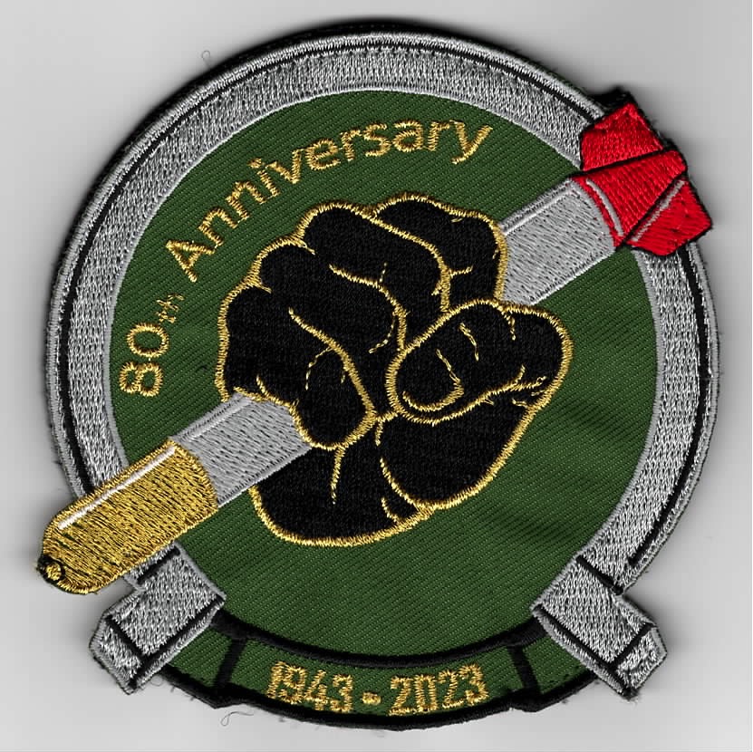 (Another AV8RSTUFF Creation): The ‘Fist of the Fleet’ from VFA-25 currently fly the F/A-18E Hornet out of NAS Lemoore, CA. They were established in January 1943 and have transitioned to the latest version of the Hornet with all the upgrades. The ‘Fist’ were paired with their sister squadron of VFA-113 to upgrade simultaneously. 2023 is the 80th year of existence for this squadron and they created this “green” version of their anniversary patch to commemorate that milestone. This patch DOES come with velcro attached.
