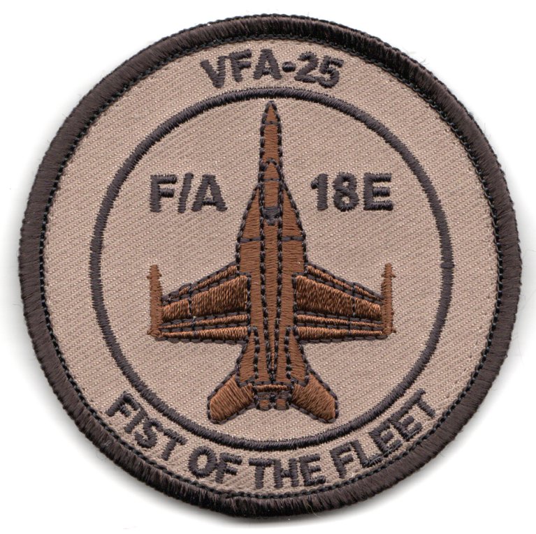 (Another AV8RSTUFF Creation): The ‘Fist of the Fleet’ from VFA-25 currently fly the F/A-18E Hornet out of NAS Lemoore, CA. They were established in January 1943 and have transitioned to the latest version of the Hornet with all the upgrades. The ‘Fist’ were paired with their sister squadron of VFA-113 to upgrade simultaneously. This is the desert ‘bullet’ patch for the F/A-18E aircraft they now operate in when deployed. This patch DOES come with velcro attached.