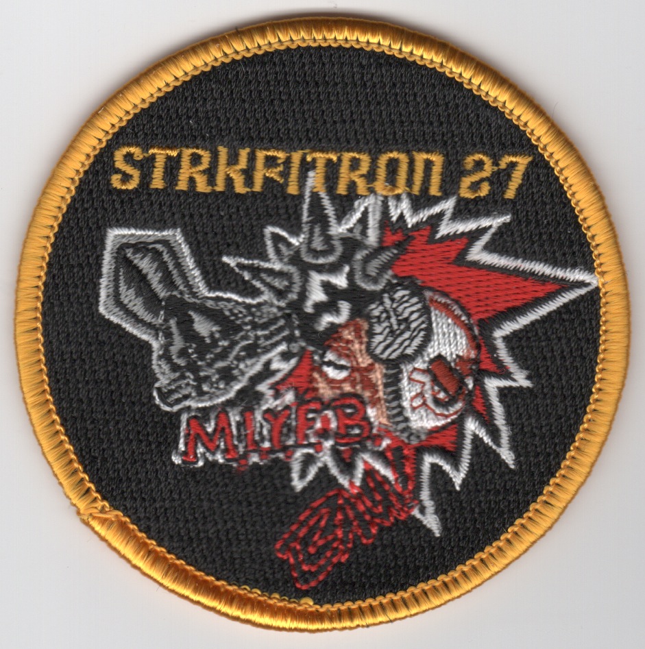 The ‘ROYAL MACES’ of NAS Lemoore, CA fly the F/A-18E/F hornet. This patch says STRKFITRON 27 across the top and MIYFB in the Rhino’s mouth…..NOT A CLUE what that means!