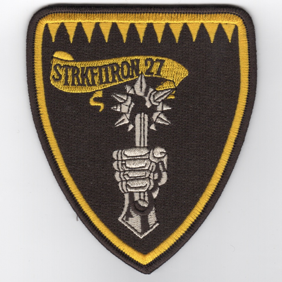 The ‘ROYAL MACES’ of NAS Lemoore, CA fly the F/A-18E/F hornet. This is the large color version of their squadron patch worn on the flight suit showing a “silver” Knight’s hand holding a “silver” mace and says STRKFITRON27 along the yellow banner at the top. This patch does not come with velcro attached.