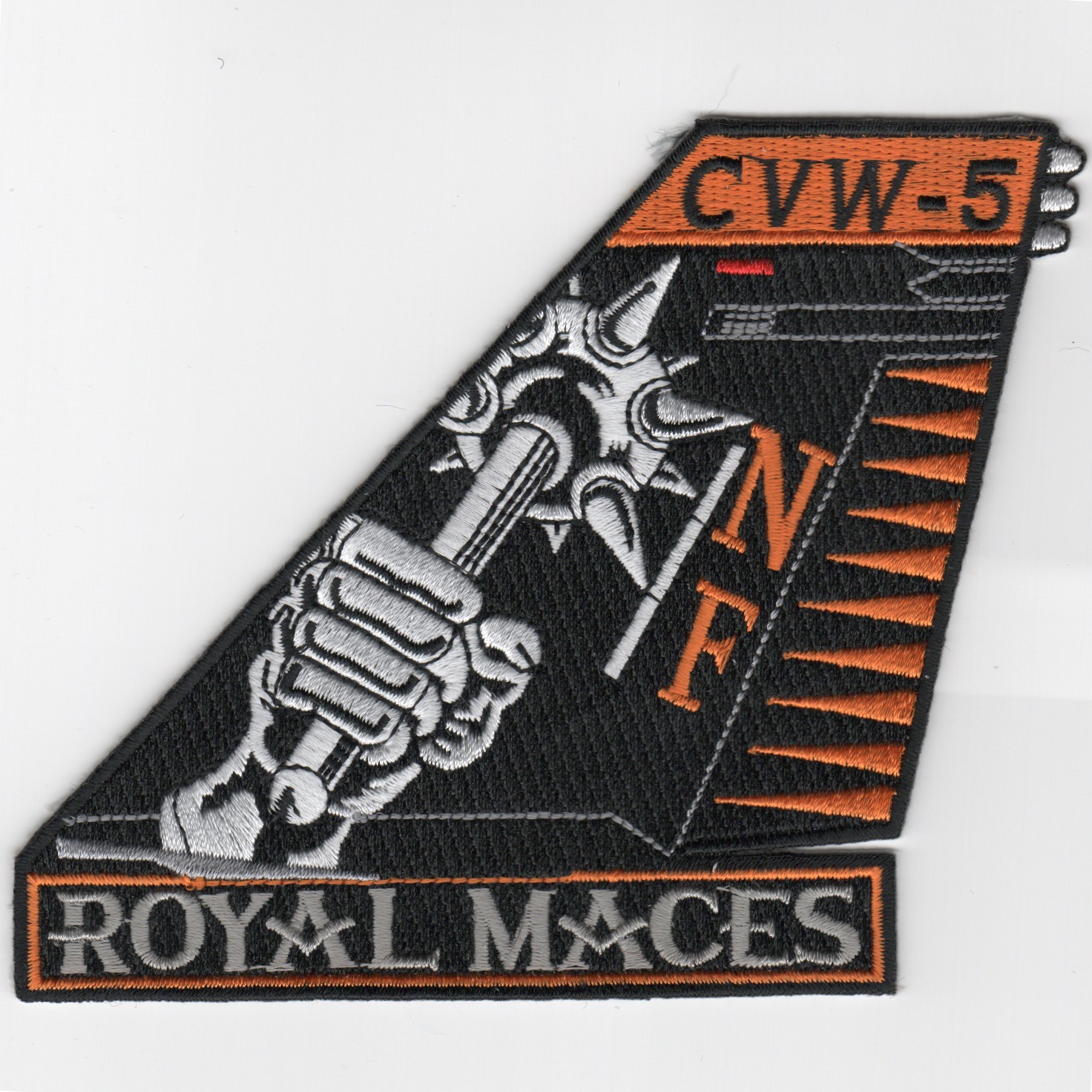 This is the “”””CVW-5″””” version of the tailfin for VFA-27 ‘Maces’. It says CVW-5 along the top and “”””ROYAL MACES”””” along the bottom.