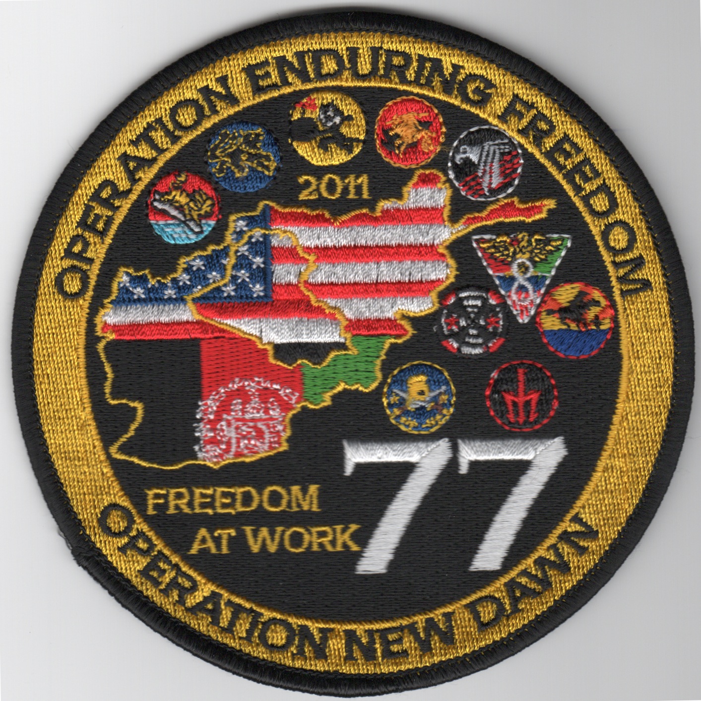 (Obtained from the Squadron): This is one of the 2011 cruise patches for VFA-31/CVN-77/CVW-8 for their Op NEW DAWN/Op ENDURING FREEDOM Cruise. It shows the squadrons attached to CVW-8 and says “”””FREEDOM AT WORK”””” near the bottom. This patch does not have velcro attached!