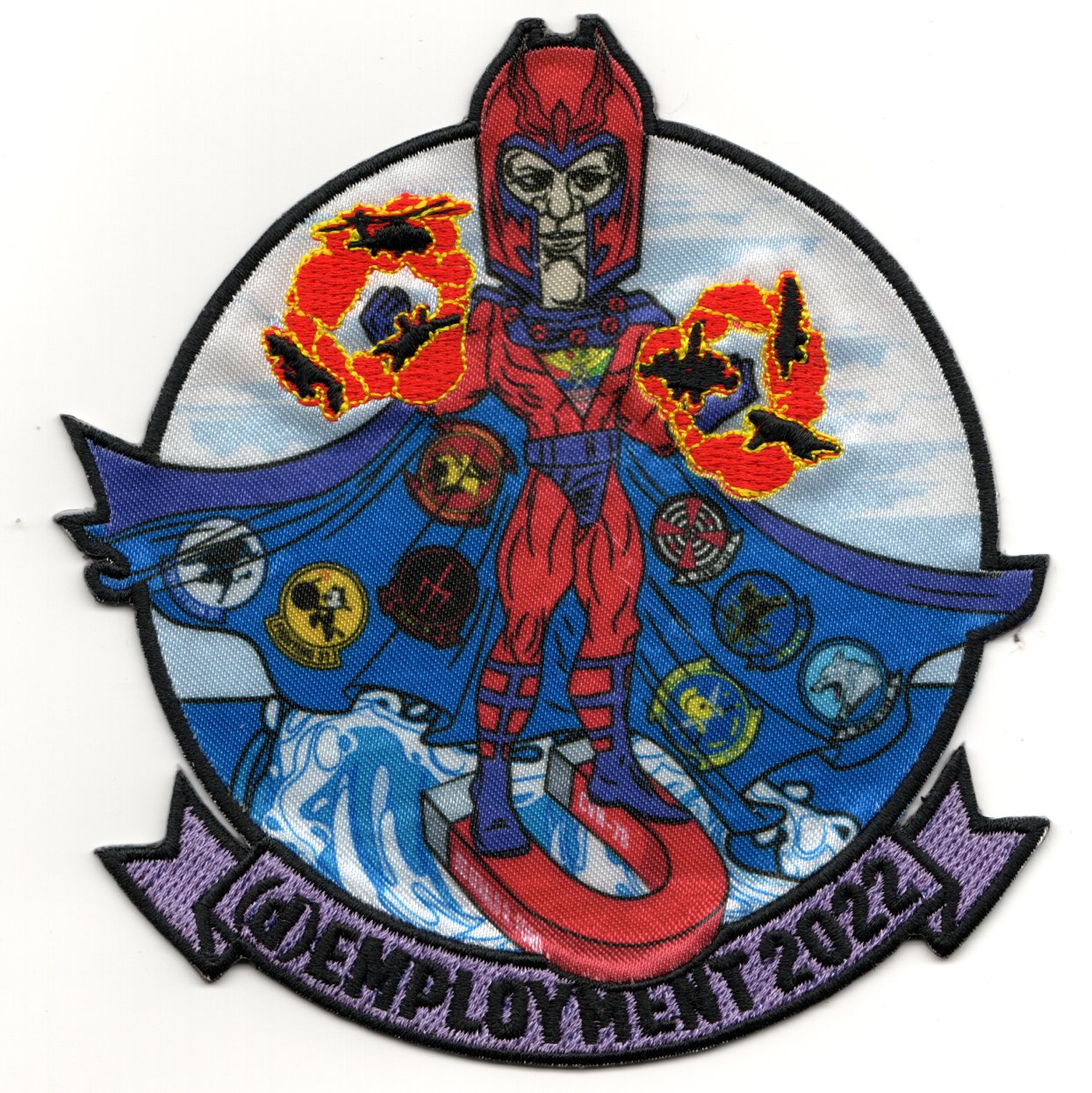 This is one of the 2022 (d)EMPLOYMENT cruise patches for VFA-31 and the other squadrons of AIRWING 8 (CVW-8) for their support of operations in Ukraine. It shows all the squadron insignias and aircraft being “controlled” by MAGNETO. This patch uses “sublimation with embroidery”, which is a more expensive method to make a patch, but gives INCREDIBLE detail. It does not come with velcro attached.