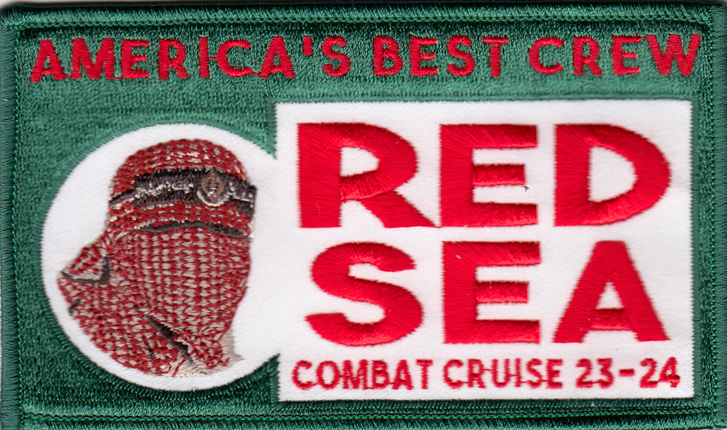 (From the Squadron supplier): This is one of the 2023-2024 combat cruise patches created for the VFA-32 SWORDSMEN that says “AMERICA’S BEST CREW” (top), “RED SEA” (center), and has the years along the bottom. Note the depiction of the ISIS-type enemy on the left side. This patch does not have velcro attached.