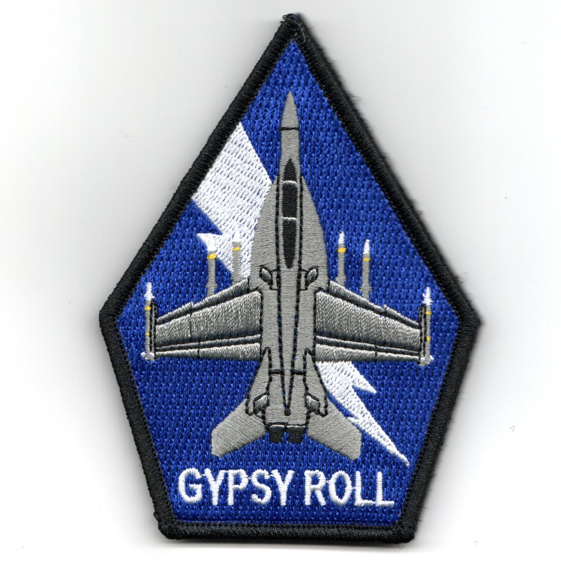 This is the blue w/black-border version of the “”””GYPSY ROLL”””” aircraft ‘coffin’ patch worn on the flightsuit sleeve by the VFA-32 Swordsmen that fly the F/A-18 Hornet. This patch DOEs come with velcro attached.