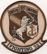 Established as VBF-3 in 1945, the squadron was redesignated VF-4A in 1946, then VF-32 in August 1948. The “Swordsmen” participated in the Lebanon strikes, the Grenada invasion, the Libyan MiG-23 ‘Flogger’ shootdown in 1985, and also in Desert Storm onboard the USS JFK (CV-67) with CVW-17. This is their current squadron patch that shows the lion with the sword and shield. This is the desert version.