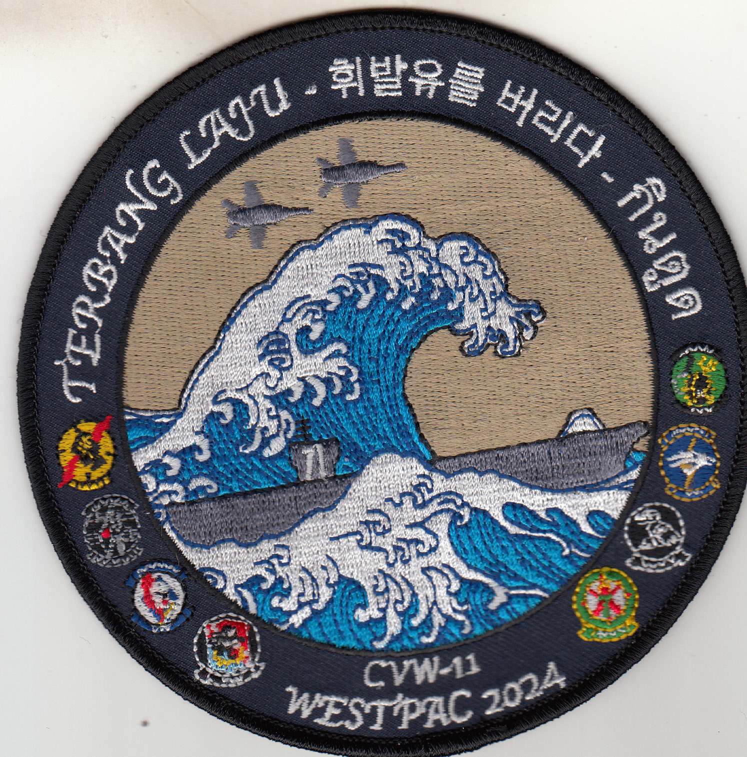(From the Squadron supplier): This is one of the 2024 WESTPAC Cruise patches created for VFA-34 that says “TERBANG LAJU” (not sure what that means), has the logos from the different squadrons in Carrier Air Wing Eleven (CVW-11) with the “rough seas” (tidal wave) crashing against the aircraft carrier while two Hornets are in the marshall stack. This patch does not have velcro attached.