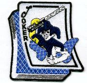 This is the blue/white version (no other colors) of the “Friday” patch for the VFA-34 Blue Blasters worn only by the aircrew. It shows their ‘mascot’ (a joker) wielding an instrument of destruction. According to ‘The Hook’ (Tailhook’s magazine), the VFA-34 “Friday” patch with the joker on the cards is VF-20s WW II first cruise (1944) insignia. This patch does not come with velcro attached.
