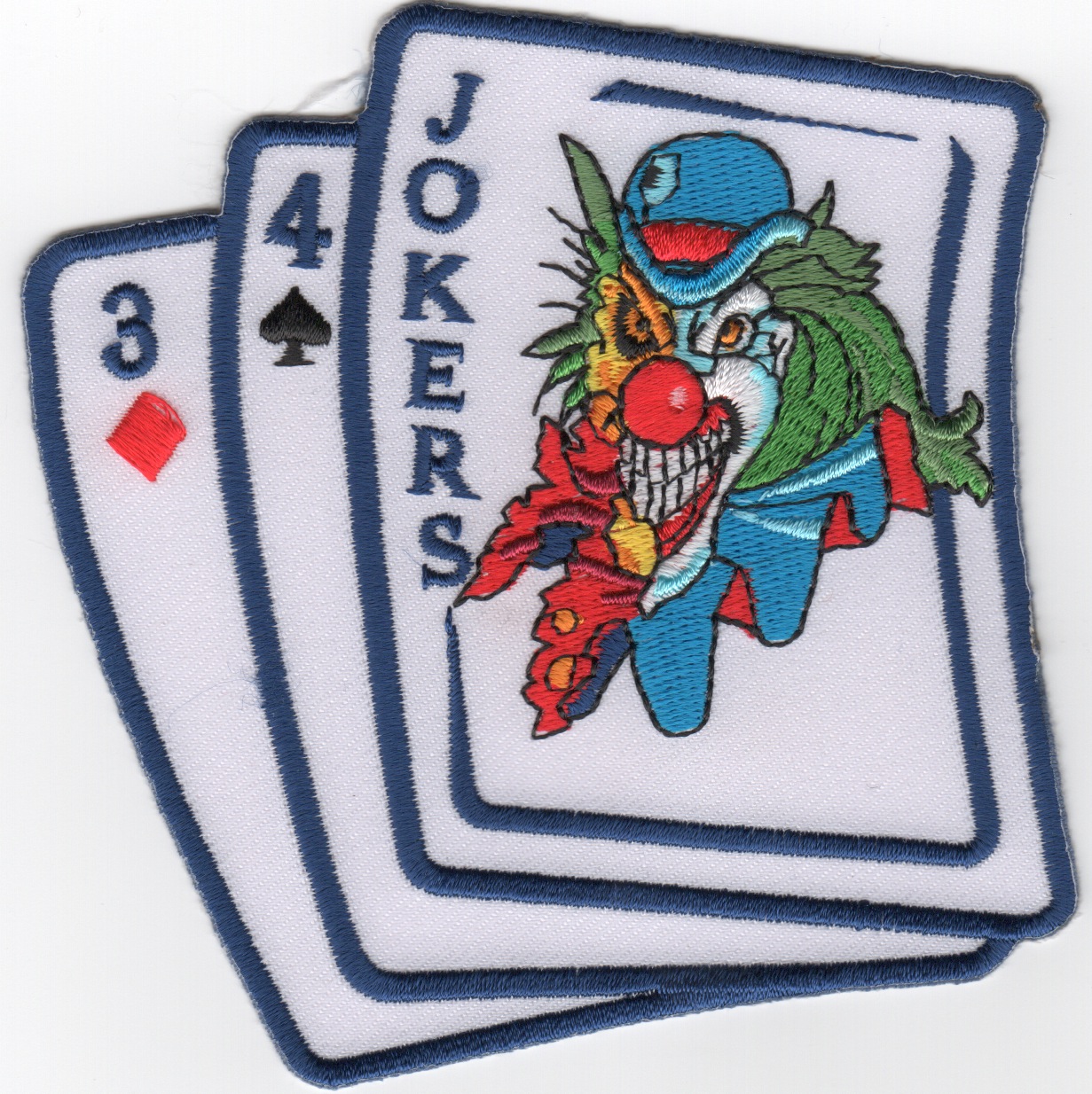 This is the multi-colored version of the “Friday” patch for the VFA-34 Blue Blasters worn only by the aircrew. It shows their ‘mascot’ (a joker) wielding an instrument of destruction. According to ‘The Hook’ (Tailhook’s magazine), the VFA-34 “Friday” patch with the joker on the cards is VF-20s WW II first cruise (1944) insignia. This patch does not come with velcro attached.