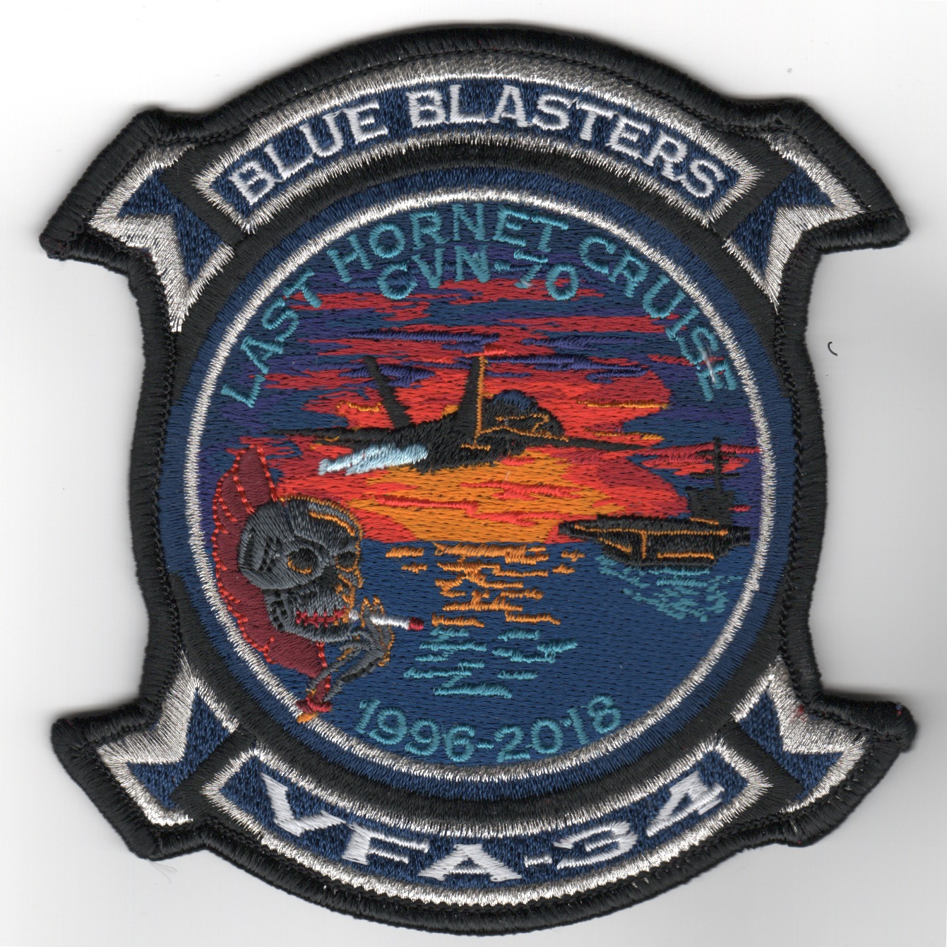 This is another AV8RSTUFF creation for the VFA-34 “Blue Blasters”. This is the TWO-ROCKER version (above and below) of their 2018 “LAST HORNET CRUISE” before they transition to the F-35 after this deployment. This is an incredibly detailed, stitched patch with the text “LAST HORNET CRUISE CVN-70” (top) and 1996-2018 (bottom) with a lot of other details in it. Definitely, a MUST HAVE patch……no velcro on the back.