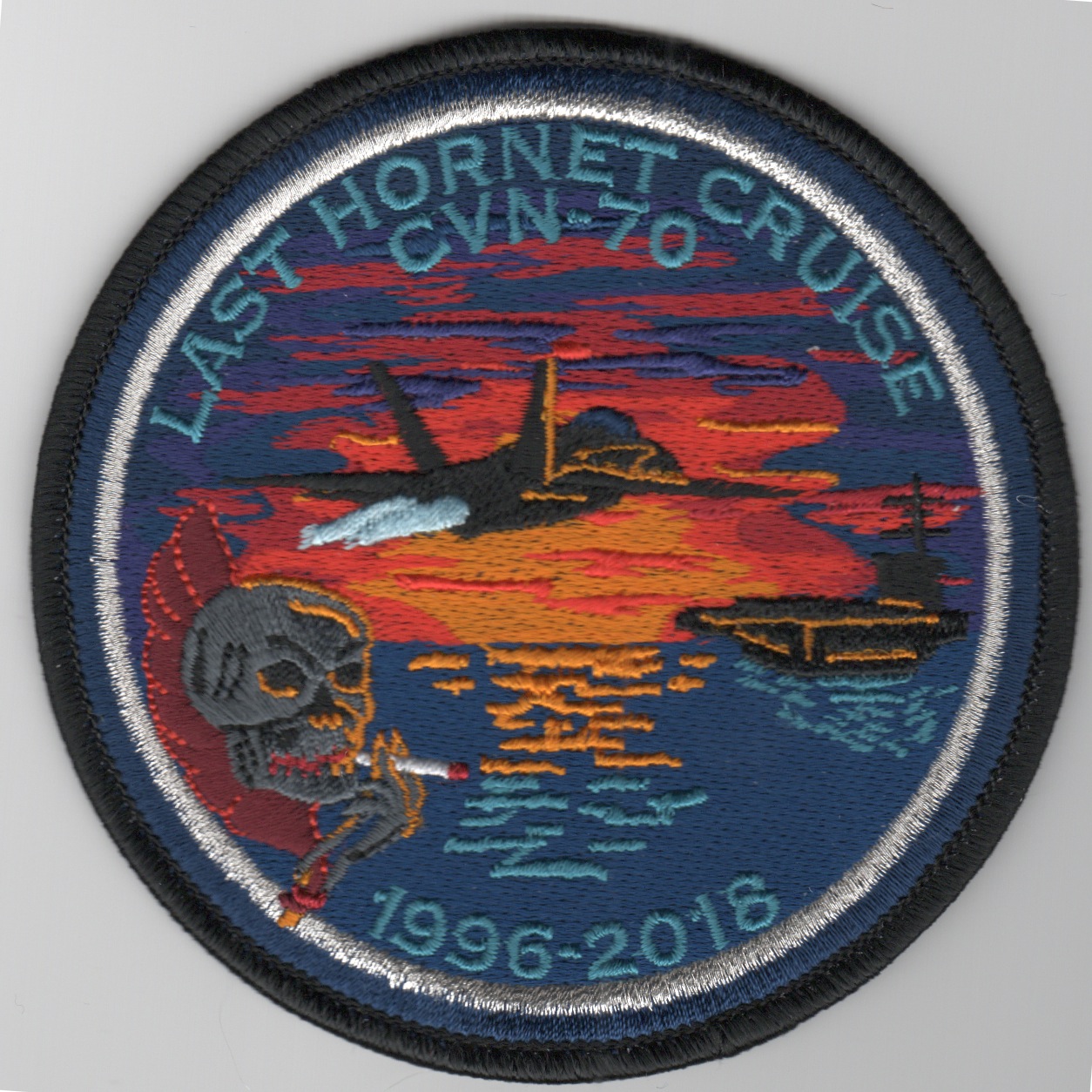 This is another AV8RSTUFF creation for the VFA-34 “Blue Blasters”. This is the ROUND version (above and below) of their 2018 “LAST HORNET CRUISE” before they transition to the F-35 after this deployment. This is an incredibly detailed, stitched patch with the text “LAST HORNET CRUISE CVN-70” (top) and 1996-2018 (bottom) with a lot of other details in it. Definitely, a MUST HAVE patch……no velcro on the back.