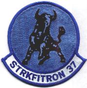 Strike Fighter Squadron 37 (VFA-37), also known as the “Ragin’ Bulls”, is a US Navy F/A-18E Super Hornet fighter squadron stationed at NAS Oceana. They are a part of Carrier Air Wing 8 (CVW-8) and are attached to USS George H. W. Bush. Their radio callsign is Ragin’ and their tail code is AJ. The squadron’s initial insignia was approved by CNO on 26 March 1968. The design (centered on a bull) was selected to symbolize the spirit, pride and mission of the unit. The original insignia was designed and drawn in house after suggestions from VA-37’s first Commanding Officer – Cdr Burnett and the design was drawn by the squadrons’ Maintenance Office AZ3 L.A. Smith. Little was changed from submission to CNO approval. The Bulls current insignia was based on the Schlitz Malt Liquor logo. Over the years, the size of the testicles has been changed several times. After the Tailhook scandal, the testicles were removed completely from the logo for a time. The “Bulls” of VFA-37 were formerly a Vought A-7 Corsair II squadron, but now fly the F/A-18 SUPER HORNET as part of CVW-3. They participated in Operation Desert Storm from the USS J. F. Kennedy. This is the blue version of their “old” squadron patch and does not come with velcro attached.