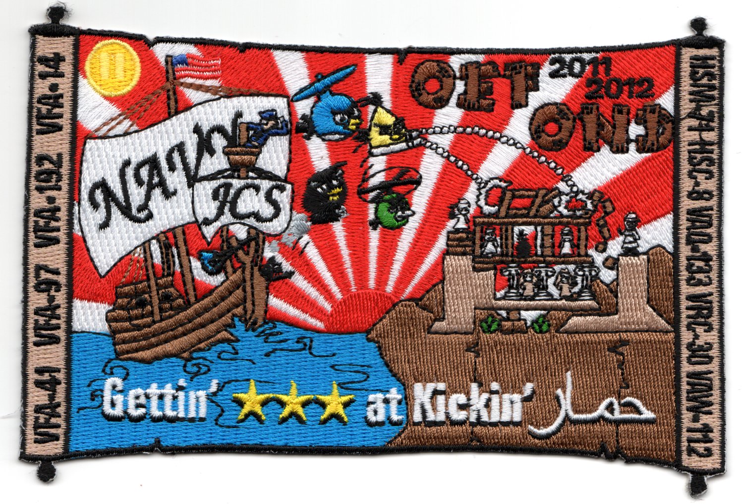 (From the Squadron Mess): This is one of the 2011-2012 OEF/OND ‘JOINT’ Cruise patches created for the squadrons of Carrier Air Wing Eleven (CVW-11). It depicts the “Angry Birds” being catapulted from the two-masted schooner onto a desert castle and says “GETTIN’ * * * at Kickin’ (arabic)”. It’s designed in the shape of a ‘puzzle-piece’ if you look on the very corners and does not come with velcro attached! Since this was old inventory for the squadron, I was only able to get a few!!