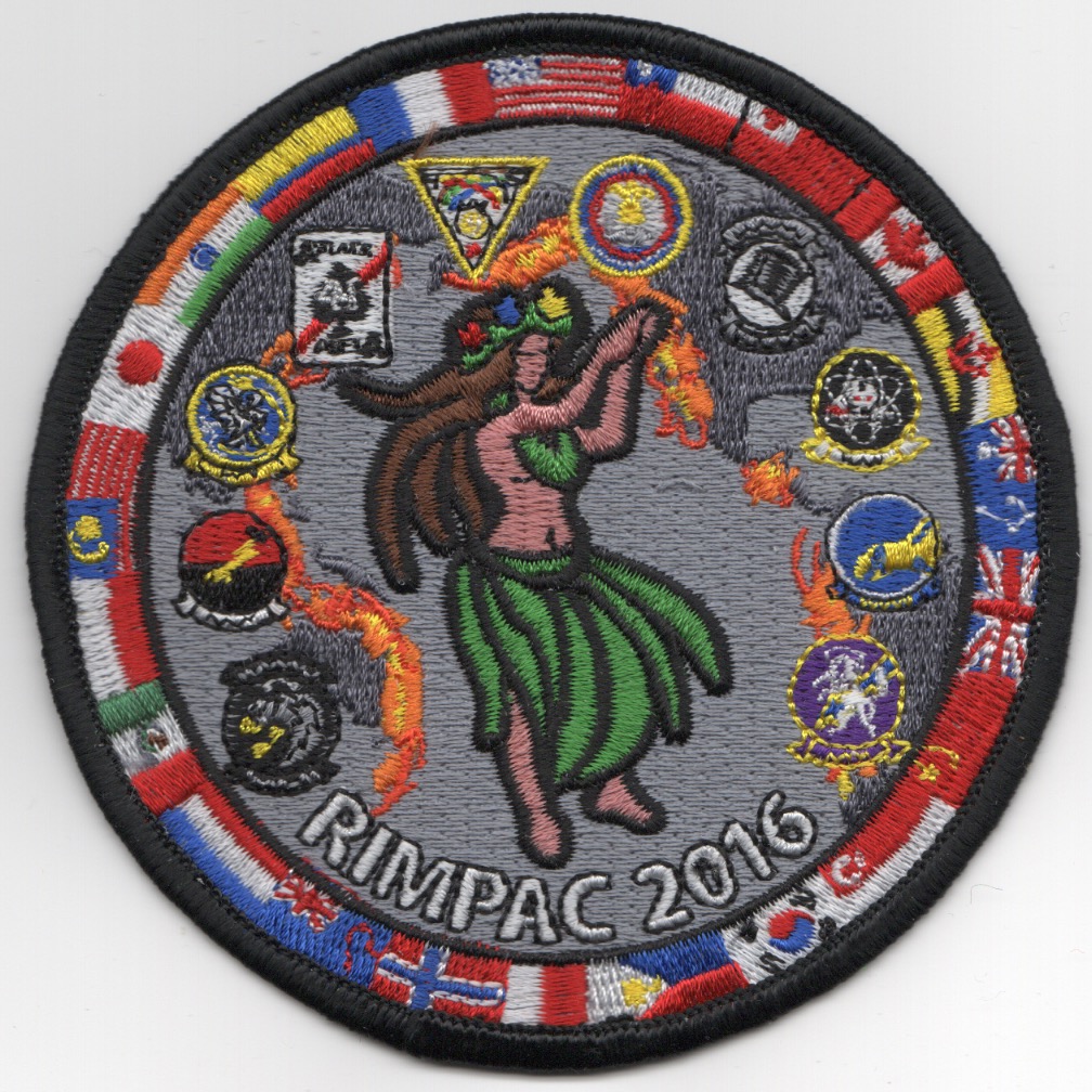 (Obtained from their supplier): This is one of the “joint endeavor” patches created by both VFA-14 Tophatters and VFA-41 Black Aces for their 2016 “RIMPAC” cruise. It shows a “HULA” girl dancing across the Pacific Rim countries, has the logos of all the squadrons in the Airwing, and the flags of the countries that line the “PACIFIC RIM”. This patch does not come with velcro attached!