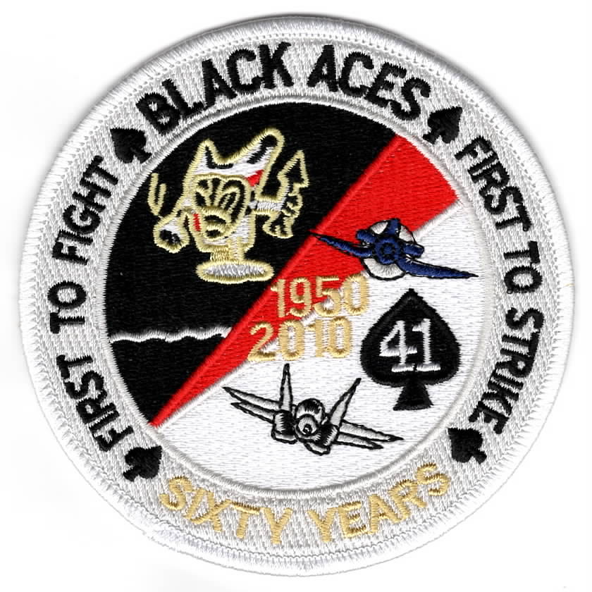 This is the 60th Anniversary ‘historical’ patch created for the VFA-41 Black Aces commemmorating their lineage. It shows both their mascots (The Playing Card and the Ace of Spades), says 1950-2000 (middle), says “SIXTY YEARS” (bottom), and says “FIRST TO FIGHT” (left) / ” FIRST TO STRIKE” (right). This patch does not come with velcro attached.