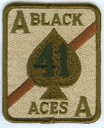 The “Black Aces” of VF-41 now operate the F/A-18F out of NAS Lemoore, CA. Callsign “Fast Eagle”, they were established in September 1950 and transitioned from the F-4Ns in April 1976 to their current platform. In August 1981, the Black Aces downed 2 Su-22 “Fitter” fighters after being attacked during an exercise. They participated in several exercises and flew from the decks of several carriers. They also shifted to the USS Lincoln (CVN-72) for ‘cleanup’ operations at the end of Desert Storm. This is the desert version of their squadron patch.