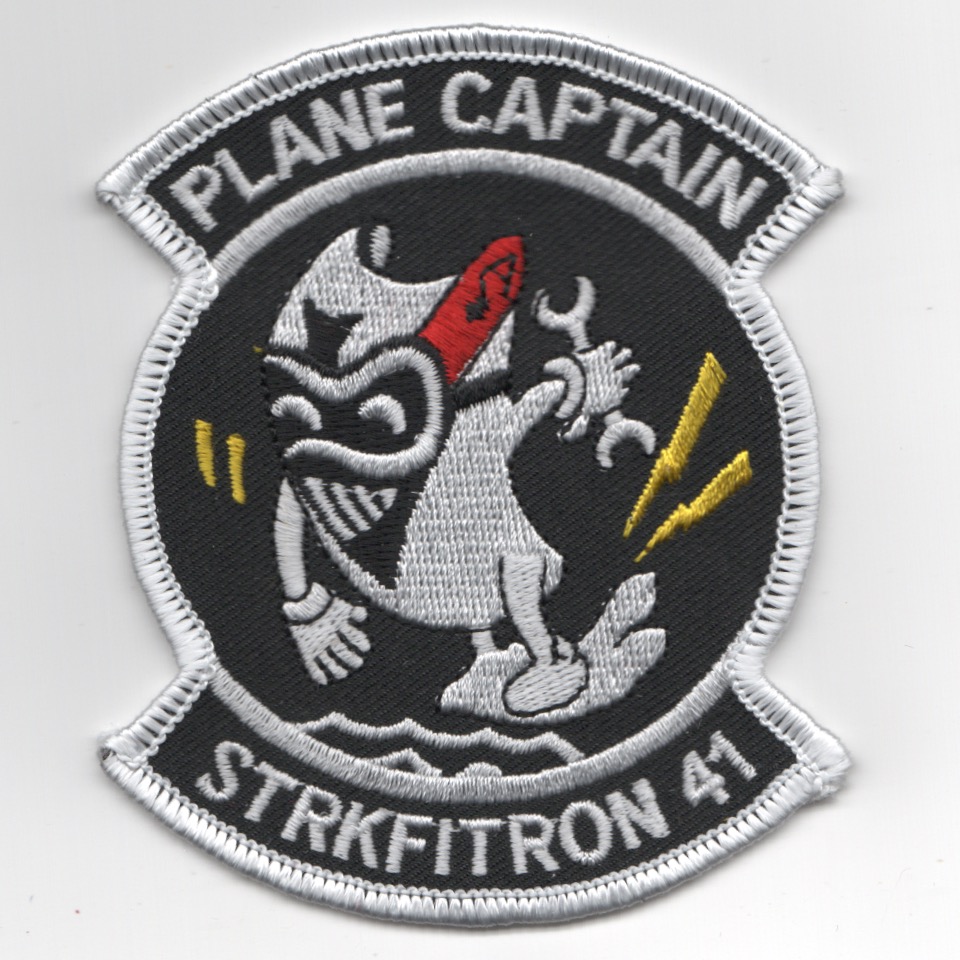 This is the “felix-shaped” patch created by the Black Aces that says “PLANE CAPTAIN” (top), “STRKFITRON 41” (bottom), and depicts their “Ace of Spades” mascot getting a WRENCH ready to launch. This patch does not come with velcro attached.