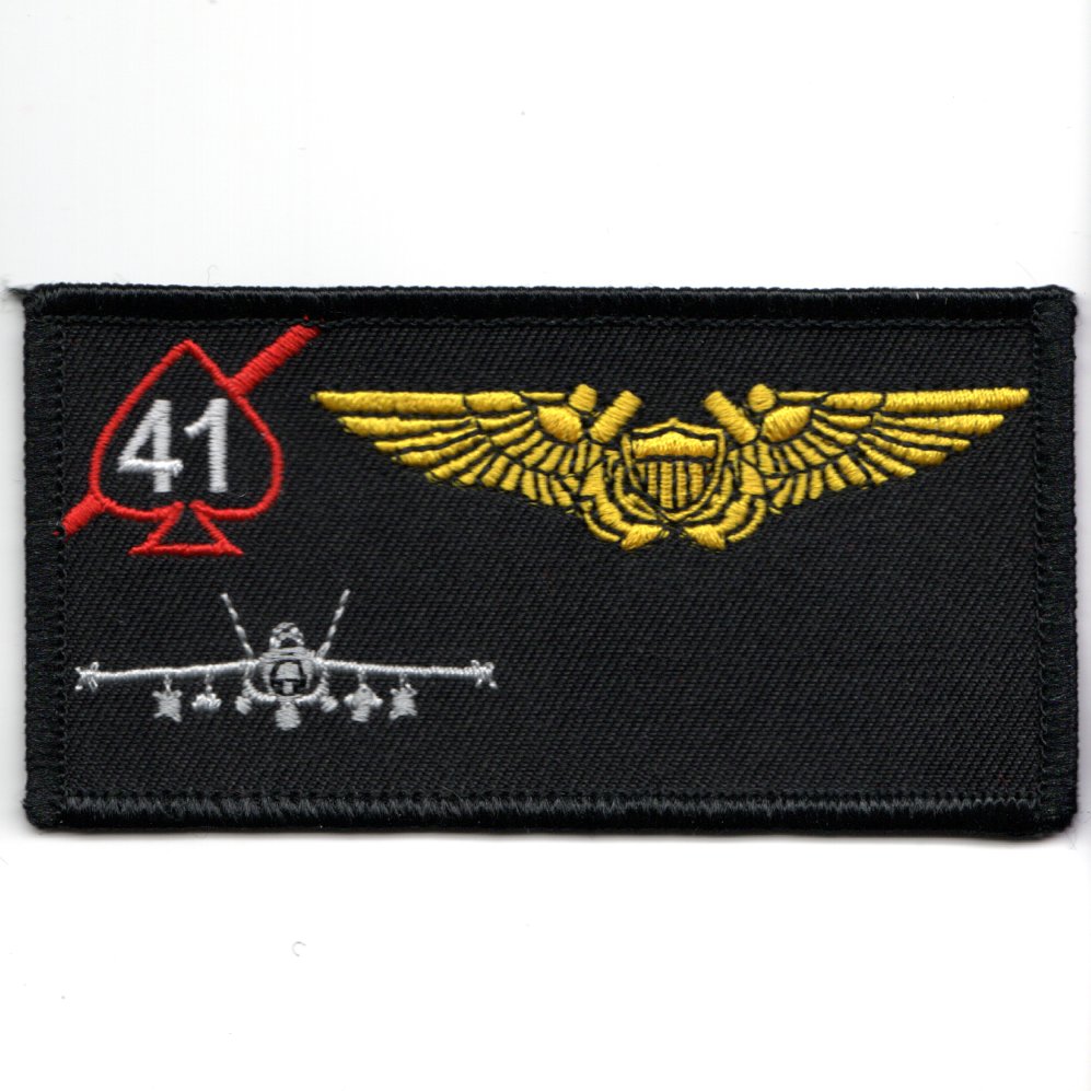 This is the black version (with a black border) of the WSO nametag with the F-18 Hornet for the VFA-41 BLACK ACES. It does not come with velcro so that you can have it embroidered.