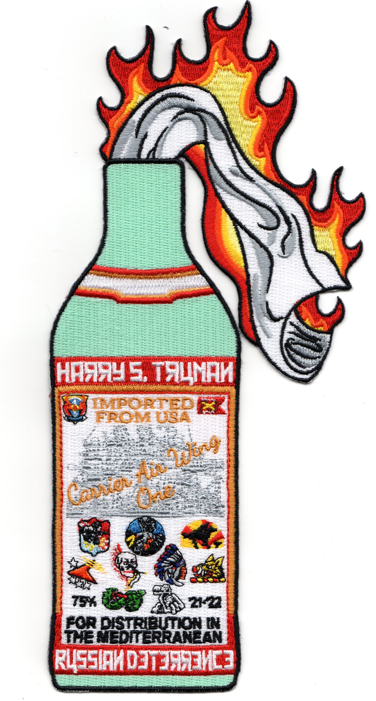 This is one of the 2021-2022 Cruise patches for VFA-81 (and the other CVW-1 Squadrons) for their support during the MULTIPLE operations in the Mediterranean and Adriatic Sea. CVW-1 was deployed in support of operations in the Ukraine. This patch is the infamous “”””MOLOTOV COCKTAIL”””” design with the motto being “”””RUSSIAN DETERENCE””””. This patch is designed to be the centerpiece on a jacket or helmet bag and does not have velcro attached.