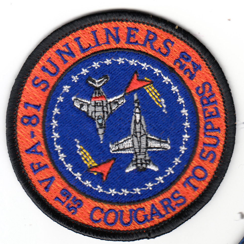 (From the Squadron supplier): The ‘Sunliners’ of VFA-81 operate the F/A-18E Super Hornet out of NAS Oceana, VA after having moved up from NAS Cecil Field, FL. They originally operated the A-7 Corsair until transitioning to the F/A-18 Hornet in February 1988. This is their *69-YEAR* anniversary bullet patch that has the dates 1955 – 2024 depicted with both aircraft flown. This patch does not come with velcro already attached.