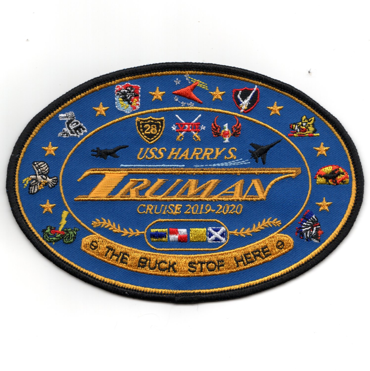 This is one of the 2019/20 Cruise patches for VFA-81 as part of CVW-1 while onboard USS Truman (CVN-75). It says “”””THE BUCK STOP HERE”””” (note there is no ‘S’ on STOP) and has all the squadron mascots from the CVW-1 along the outer border. This is a large patch and does not have velcro attached.
