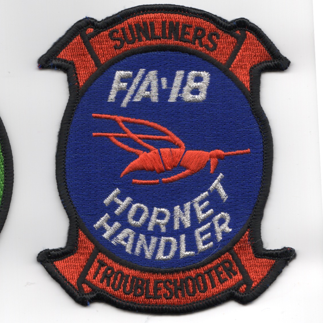 This is the maintainer patch created by VFA-81 SUNLINERS for their “HORNET HANDLERS” and “TROUBLESHOOTERS”. They are the personnel called when something goes wrong in the aircraft during preflight/postflight, so that those experts can fix the issues the aircrew encounter. Can’t operate without the hard work, pride, and attention to detail of these guys/gals…..to them, us aircrew owe a great debt of gratitude!! This patch does not come with velcro attached.