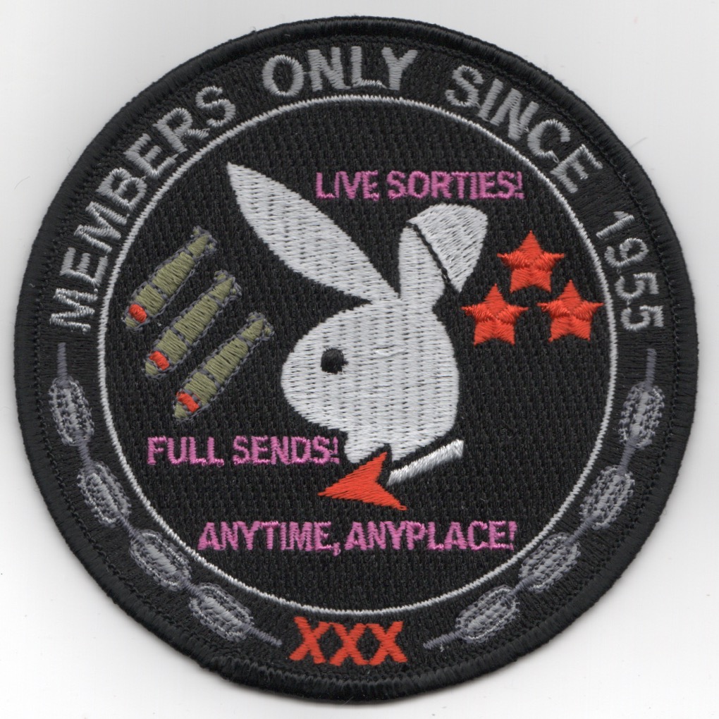 This patch comes from VFA-81. Not sure of the story behind this, but it pays homage to the 1970’s/1980’s very popular “MEMBERS ONLY” jacket. This one has a lot of “inuendos” on it, most of which only the squadron members know! This patch does not come with velcro attached.