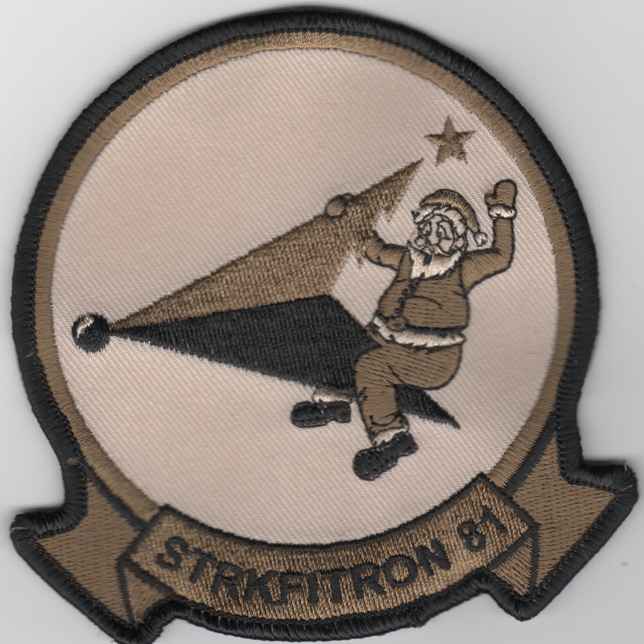 Strike Fighter Squadron 81 (VFA-81), also known as the “Sunliners”, is a USN F/A-18E Super Hornet StrikeFighter squadron stationed at NAS Oceana. They are currently assigned to Carrier Air Wing ONE (CVW-1). Their mission is to conduct prompt and sustained combat operations from the sea. The squadron was originally designated VA-66 on 1 July 1955, was redesignated VF-81 the same day, redesignated VA-81 on 1 July 1959, and finally redesignated VFA-81 on 4 February 1988. This is the desert version of their *SANTA ON CHEVRON* Christmas patch and does not come with velcro attached