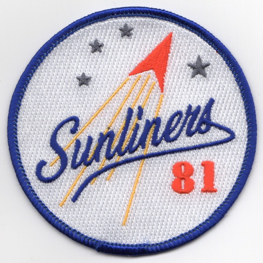The ‘Sunliners’ of VFA-81 operate the F/A-18C out of NAS Oceana, VA after having moved up from NAS Cecil Field, FL. They originally operated the A-7 Corsair until transitioning to the Hornet in February 1988. This is white bullet version (with the blue border) of their “SUNLINERS” patch, depicting the orange chevron climbing through the stars. This patch does not come with velcro already attached.