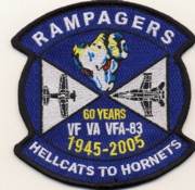 This is the 60th Anniversary patch for the VFA-83 RAMPAGERS. It shows the dates (1945 – 2005), the aircraft (Hellcat and Hornet) and says “HELLCATS TO HORNETS” along the bottom.