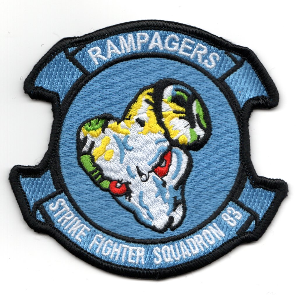Strike Fighter Squadron 83 (VFA-83), also known as the “Rampagers”, are a United States Navy F/A-18C Hornet fighter squadron stationed at NAS Oceana and are a part of Carrier Air Wing 7. In mid-1990 they made their first Hornet deployment aboard the USS Saratoga in support of Operation Desert Shield and Operation Desert Storm. For 43 days they flew 237 combat missions over Iraq and Kuwait and continue the fight to this day. This patch does not come with velcro attached.
