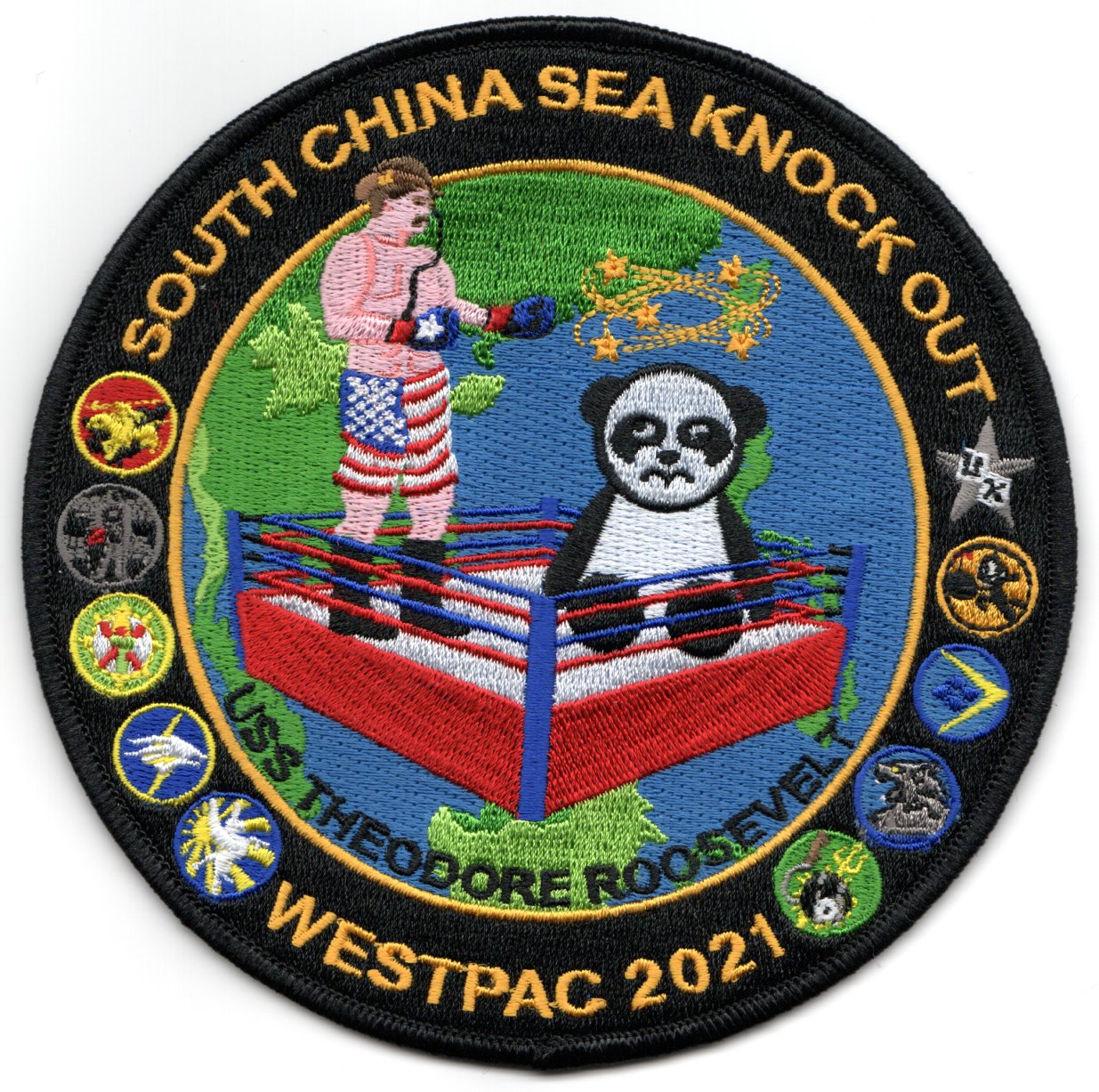 (Another AV8RSTUFF Creation): This is one of the WESTPAC 2021 patches created for VFA-87 and the sister squadrons of Airwing 11 (CVW-11). It depicts Theodore Roosevelt (the boat’s namesake) in the same boxing trunks worny by “ROCKY BALBOA” knocking out the Chinese mascot, the PANDA. It has all the squadron logos along the border of this sublimated patch and does not have velcro attached.