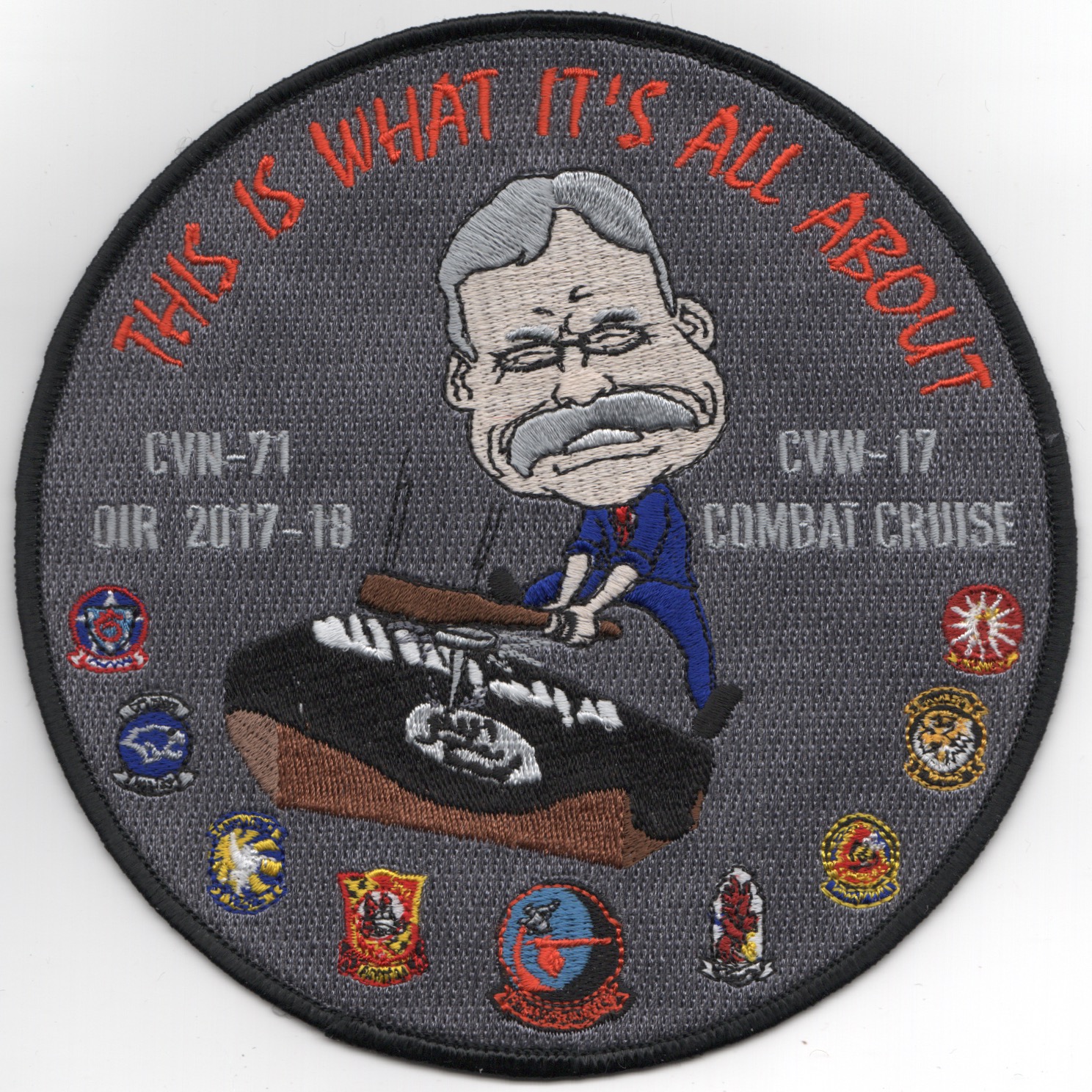 Based out of NAS Lemoore, CA flying the McDonnell Douglas F/A-18C Hornet, they were established in March 1952. They participated in Desert Storm in 1991 with CVW-11 and the USS Lincoln (CVN-72). For this deployment, they were part of AIRWING 17 (CVW-17) while onboard the USS Roosevelt (CVN-71). It says “THIS IS WHAT ITS ALL ABOUT” (top) and shows ‘Teddy Roosevelt’ with his famous ‘Big Stick’ driving a nail in the coffin of ISIS. The other squadron logos are shown along the bottom border. This is a LARGE patch and does not come with velcro attached.