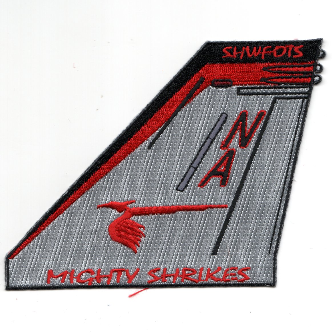 The “Mighty Shrikes” of VFA-94 now operate the F/A-18C out of NAS Lemoore, CA. This is the gray/red version with “NA” on their F/A-18C TAILFIN patch with “SHWFOTS” at the top. This patch does not have velcro attached.