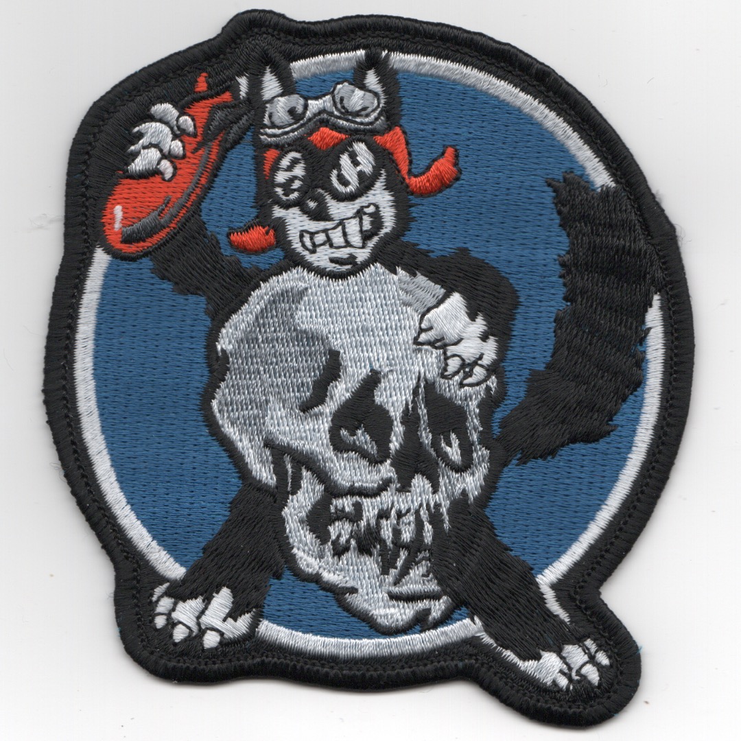 Based out of NAS Lemoore, CA flying the McDonnell Douglas F/A-18C Hornet, they were established in March 1952 and recently created this “throwback” patch to honor their lineage. This patch shows (what almost looks like) the famous Disney character, “Felix The Cat” hurling a bomb from behind a skull! This patch does not have velcro.