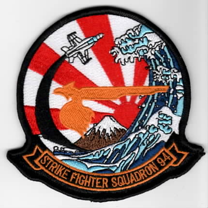 Based out of NAS Lemoore, CA flying the McDonnell Douglas F/A-18C Hornet, they were established in March 1952. They participated in Desert Storm in 1991 with CVW-11 and the USS Lincoln (CVN-72). They now fly from the deck of the Carl Vinson (CVN-70). This version of their squadron patch has the “TIDAL WAVE” with the F/A-18C Hornet flying off into the setting Japanese sun. Note this version has the “ENGLISH” script at the bottom and does not come with velcro attached.