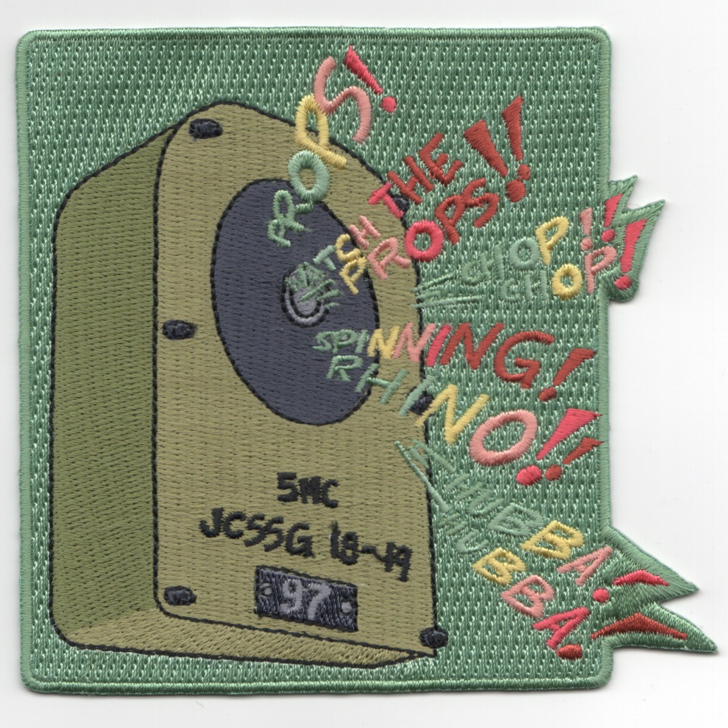 (Another AV8RSTUFF Creation): This is the 2018-2019 cruise patch created for the VFA-97 First Class Petty Officer’s Mess. It says “PROPS, WATCH THE PROPS, etc, etc with HUBBA HUBBA” at the bottom. It shows the “squawk box” which has “5MC JCSSG 18-19” at the bottom. Very detailed patch and does not come with velcro attached.