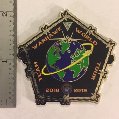 (AV8RSTUFF Creation): This is the front view of the 2018-2019 cruise COIN created for VFA-97. It says “”””STEEL STENNIS WORLD TOUR 2018-2019″””” in the middle with all the airwing’s squadron logos along the edge of the patch with the profile of the carrier in the middle. It is identical to the patch above. The back of the coin can be seen below.