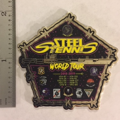 (AV8RSTUFF Creation): This is the front view of the 2018-2019 cruise COIN created for VFA-97. It says “”””STEEL STENNIS WORLD TOUR 2018-2019″””” in the middle with all the airwing’s squadron logos along the edge of the patch with the profile of the carrier in the middle. It is identical to the patch above. The back of the coin can be seen below.