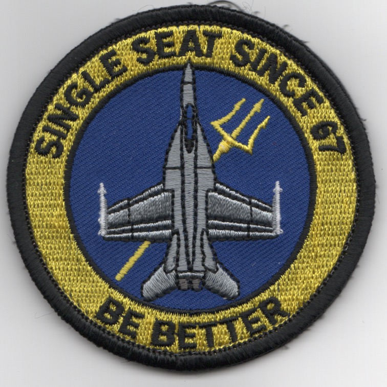 Based out of NAS Lemoore, CA flying the McDonnell Douglas F/A-18E Super Hornet, they fly with Airwing 11 onboard the USS John C. Stennis (CVN-74). This is the “BE BETTER” version of their round aircraft “bullet” patch they wear on the left sleeve of their flight suits. This patch DOES come with velcro attached.