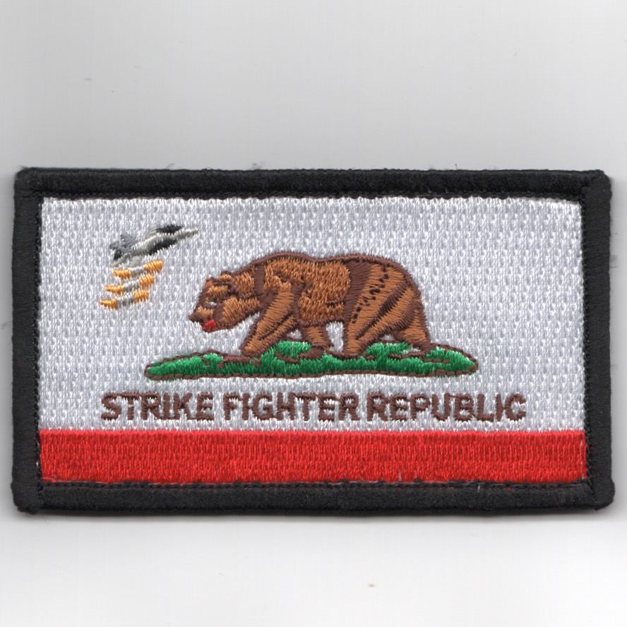 (Another AV8RSTUFF Creation): This is the VFA-97 rendition of the California State Flag with the wording changed to read “STRIKE FIGHTER REPUBLIC”. It shows an F-18 dropping weapons on the State Bear (not sure of the story behind it), and this patch does have velcro.
