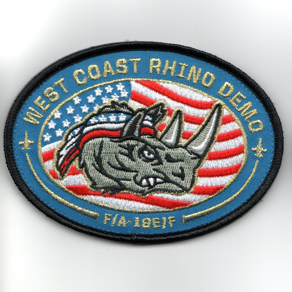 (Another AV8RSTUFF Creation): This is one of the VFA (F/A-18) *WEST COAST DEMO TEAM* oval patches. This one shows an *extremely angry/focused* Rhino head, says F/A-18E/F (bottom) and DOES come with velcro.