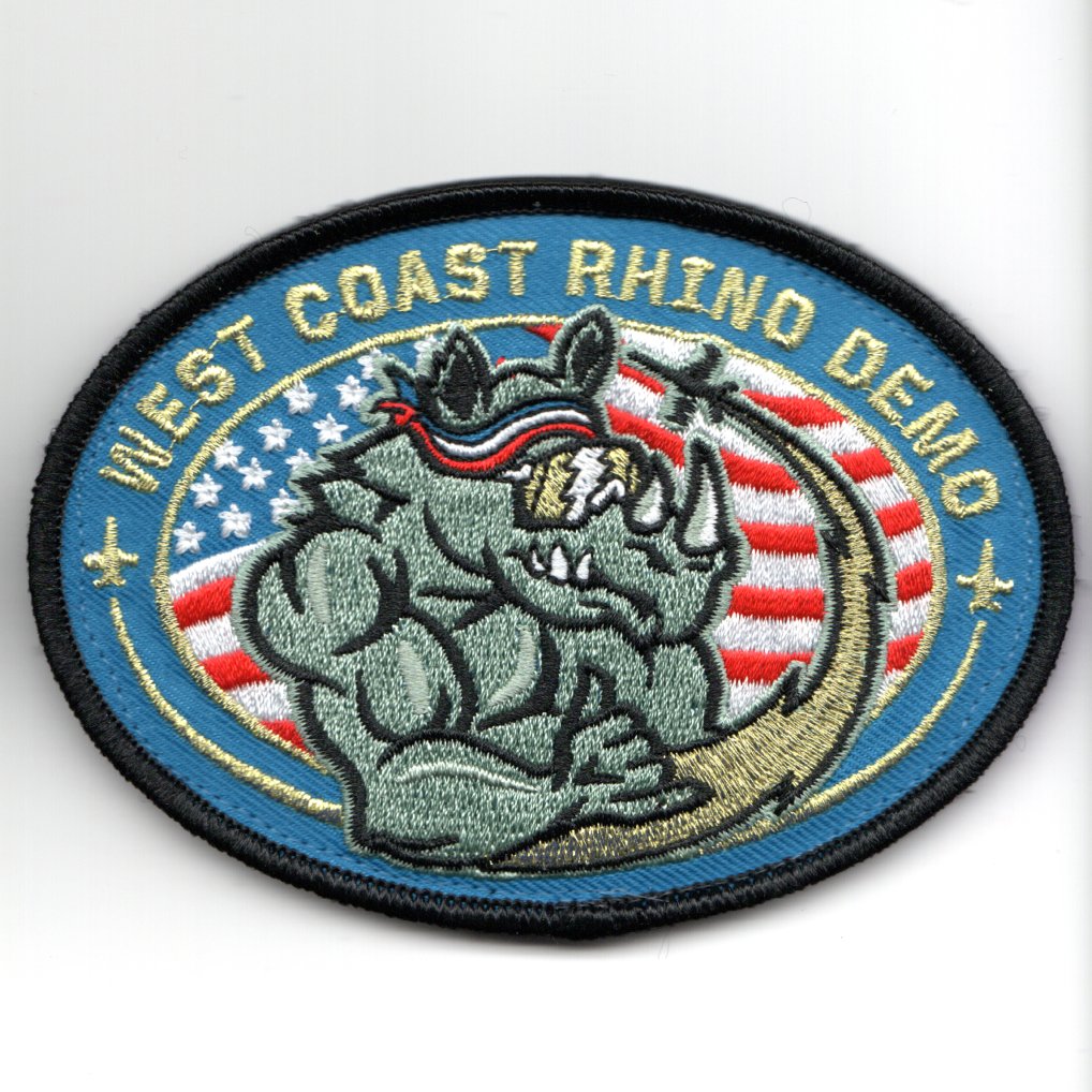 (Another AV8RSTUFF Creation): This is one of the VFA (F/A-18) *WEST COAST DEMO TEAM* oval patches. This one shows a “”””MUSCULAR RHINO w/SUNGLASSES”””” and DOES come with velcro.