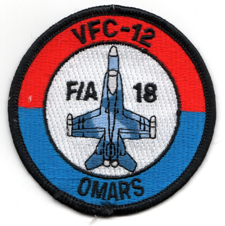 This is the “red-over-blue” F/A-18 aircraft ‘bullet’ patch for VFC-12 based out of NAS Oceana, VA. It says ‘OMARS’ along the bottom and does not come with velcro attached.