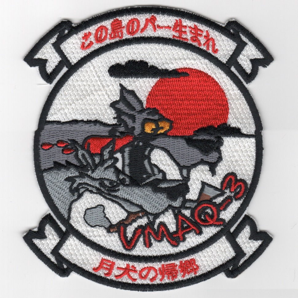 This is the WHITE version of the VMAQ-3 Squadron Patch which depicts two (what I call) “”””Crazed Coyotes”””” instead of the normal ‘Wolves’. It shows one of them smoking a pipe and the clouds are smoke from the pipe. Found this one in a Korean embroidery shop recently in limited quantities. It does NOT have velcro attached.