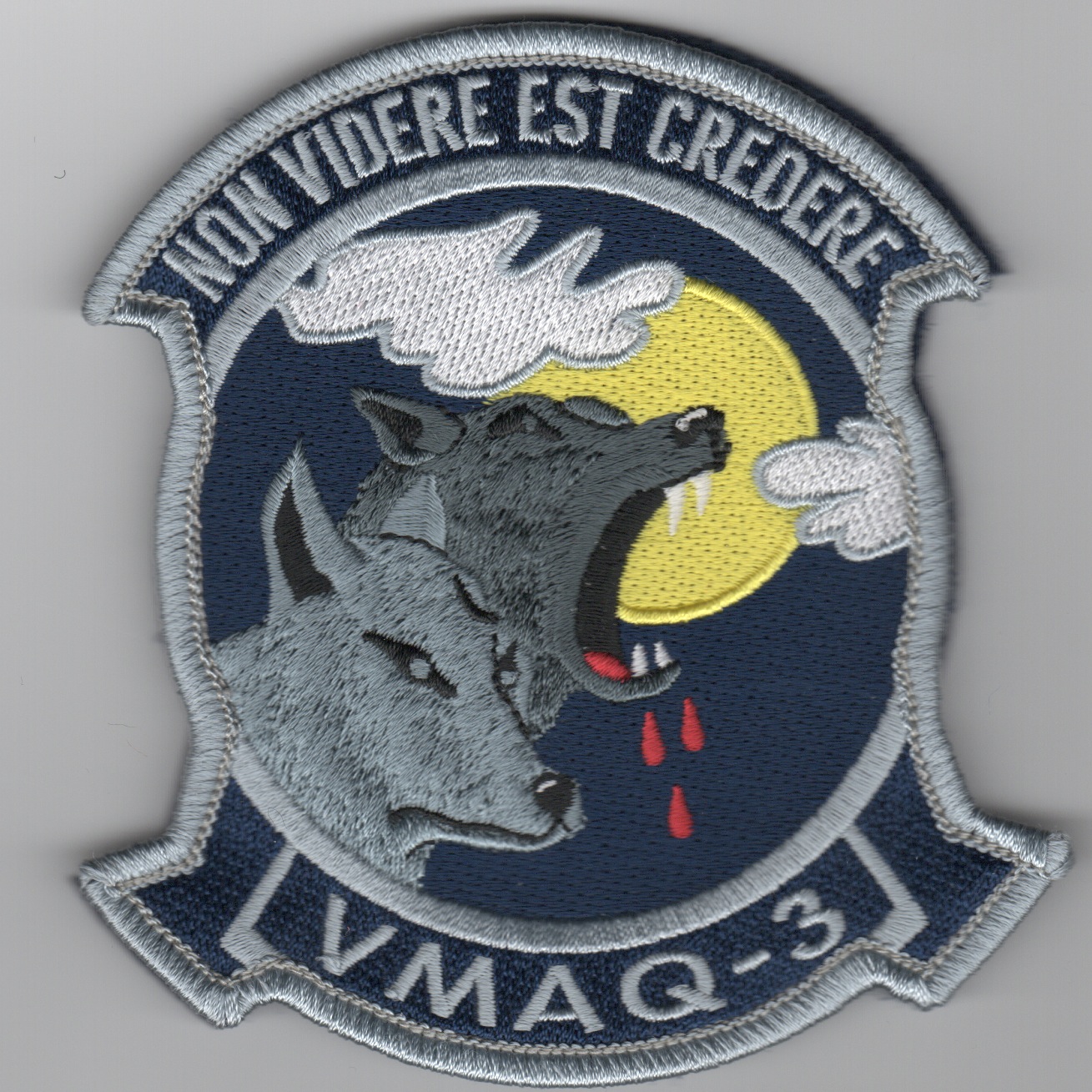 The Moondogs of VMAQ-3 deployed to Incirlik, Turkey in early 2017 in support of combat operations for Operation INHERENT RESOLVE in supporting the fight against DaÕesh. This blue squadron patch was created by AV8RSTUFF for their “normal” (green) flightsuits and notice the difference in the “fur” of the wolves. This squadron patch has “furry” wolves instead of the “normal” stitching, and comes with velcro attached.