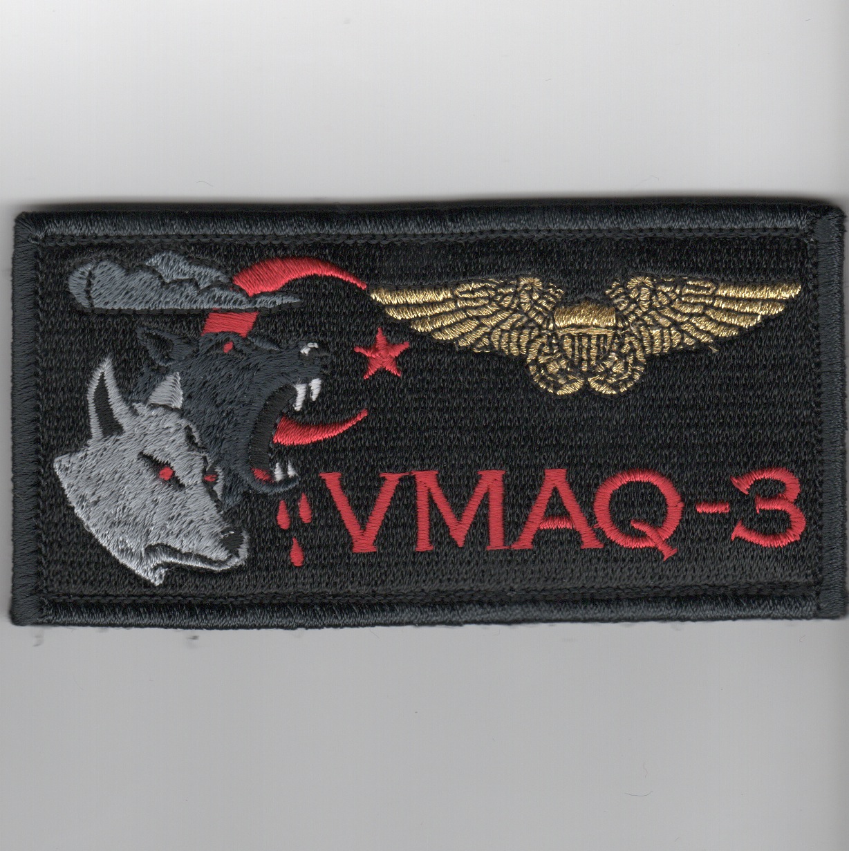 The Moondogs of VMAQ-3 deployed to Incirlik, Turkey in early 2017 in support of combat operations for Operation INHERENT RESOLVE in supporting the fight against DaÕesh. This black nametag with NFO wings with “VMAQ-3” pre-embroidered was created by AV8RSTUFF for their deployed wear and comes with velcro attached.