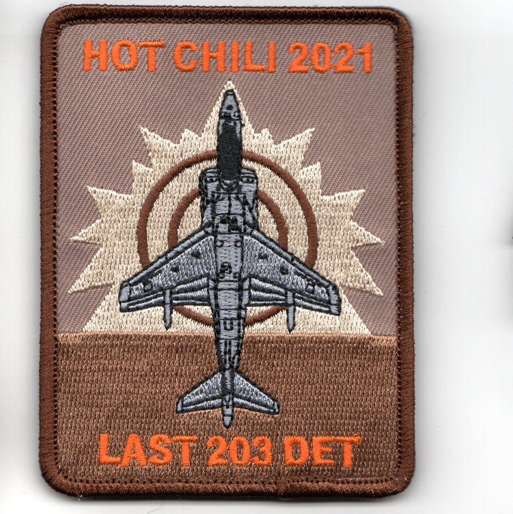 (Another AV8RSTUFF Creation): Marine Attack Training Squadron 203 (VMAT-203) is a squadron in the USMC that trains naval aviators to fly the AV-8B Harrier. Also known as the Hawks, the squadron is based at MCAS Cherry Point, NC and falls under the command of Marine Aircraft Group 14 (MAG-14) and the 2nd Marine Aircraft Wing (2nd MAW). This is the rectangular version of the “LAST EL CENTRO DET” patches created for them and says “HOT CHILI 2021” (top) and “LAST 203 DET” (bottom)!! This patch DOES come with velcro already attached.