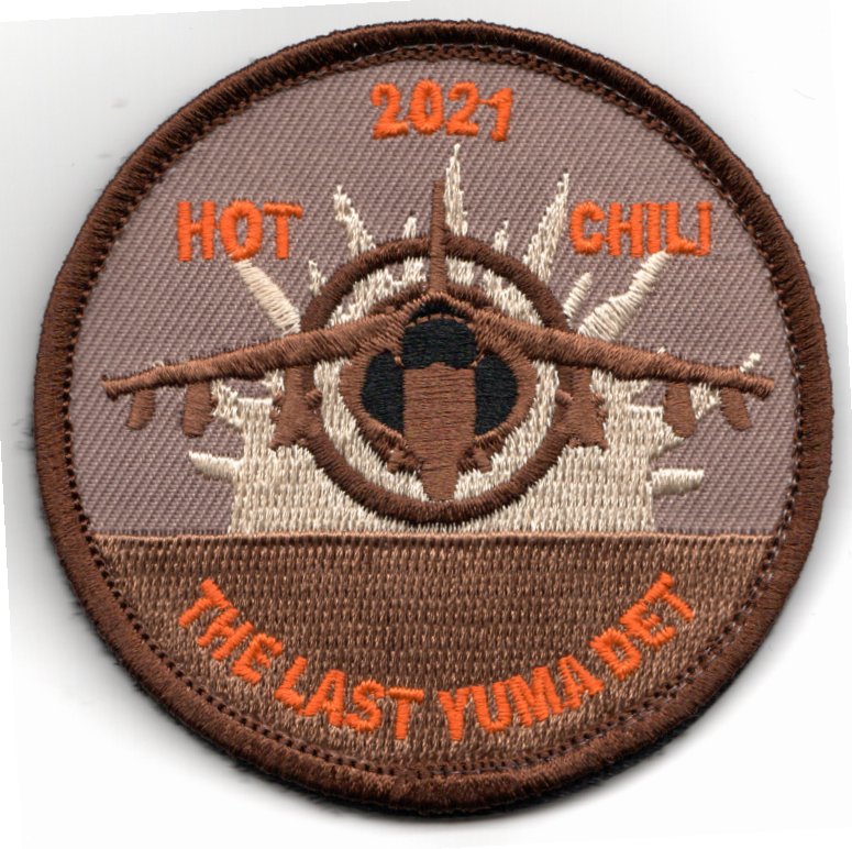 (Another AV8RSTUFF Creation): Marine Attack Training Squadron 203 (VMAT-203) is a squadron in the USMC that trains naval aviators to fly the AV-8B Harrier. Also known as the Hawks, the squadron is based at MCAS Cherry Point, NC and falls under the command of Marine Aircraft Group 14 (MAG-14) and the 2nd Marine Aircraft Wing (2nd MAW). This is the round version of the “LAST EL CENTRO DET” patches created for them and says “HOT CHILI 2021” (top) and “LAST 203 DET” (bottom)!! This patch DOES come with velcro already attached.