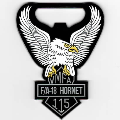 (Another AV8RSTUFF Creation): This is the metal bottle opener created for the VMFA-115 SILVERHAWKS. It is in the same shape as the Harley Eagle design (top of page) and says VMFA-115 F/A-18 HORNET. On the back, is says “SMOKE EM IF YOU GOT EM”…..Only have a few of these.
